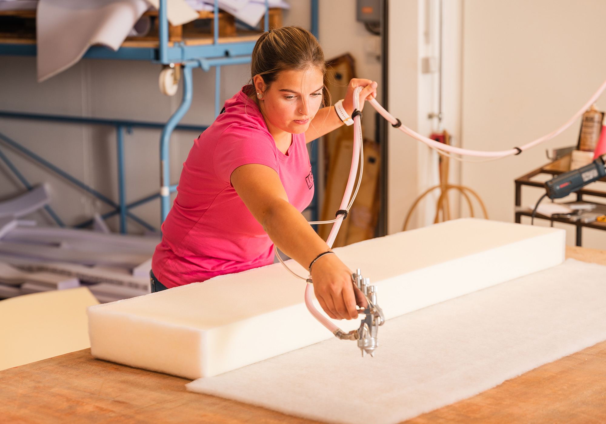 Sitzschaumstoff mit Vlies bekleben